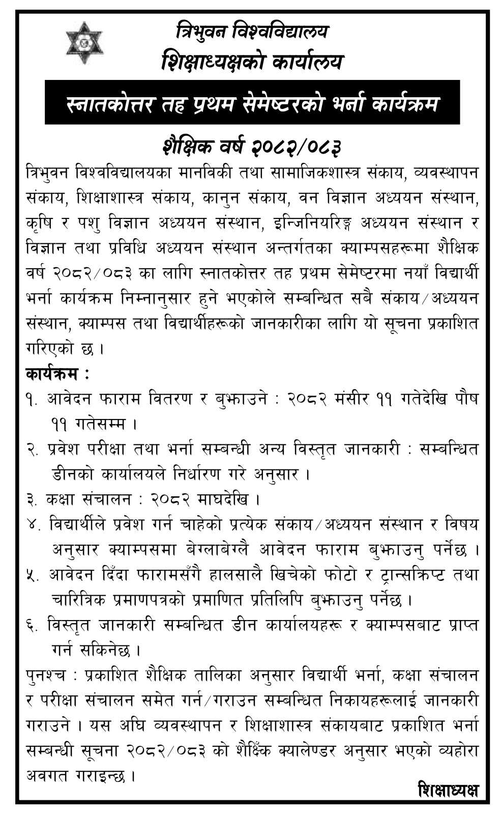 त्रिभुवन विश्वविद्यालय, शिक्षाध्यक्षको कार्यालयद्वारा प्रकाशित स्नातकोत्तर तह प्रथम सेमेष्टरको भर्ना कार्यक्रम (शैक्षिक वर्ष २०८२।२०८३)