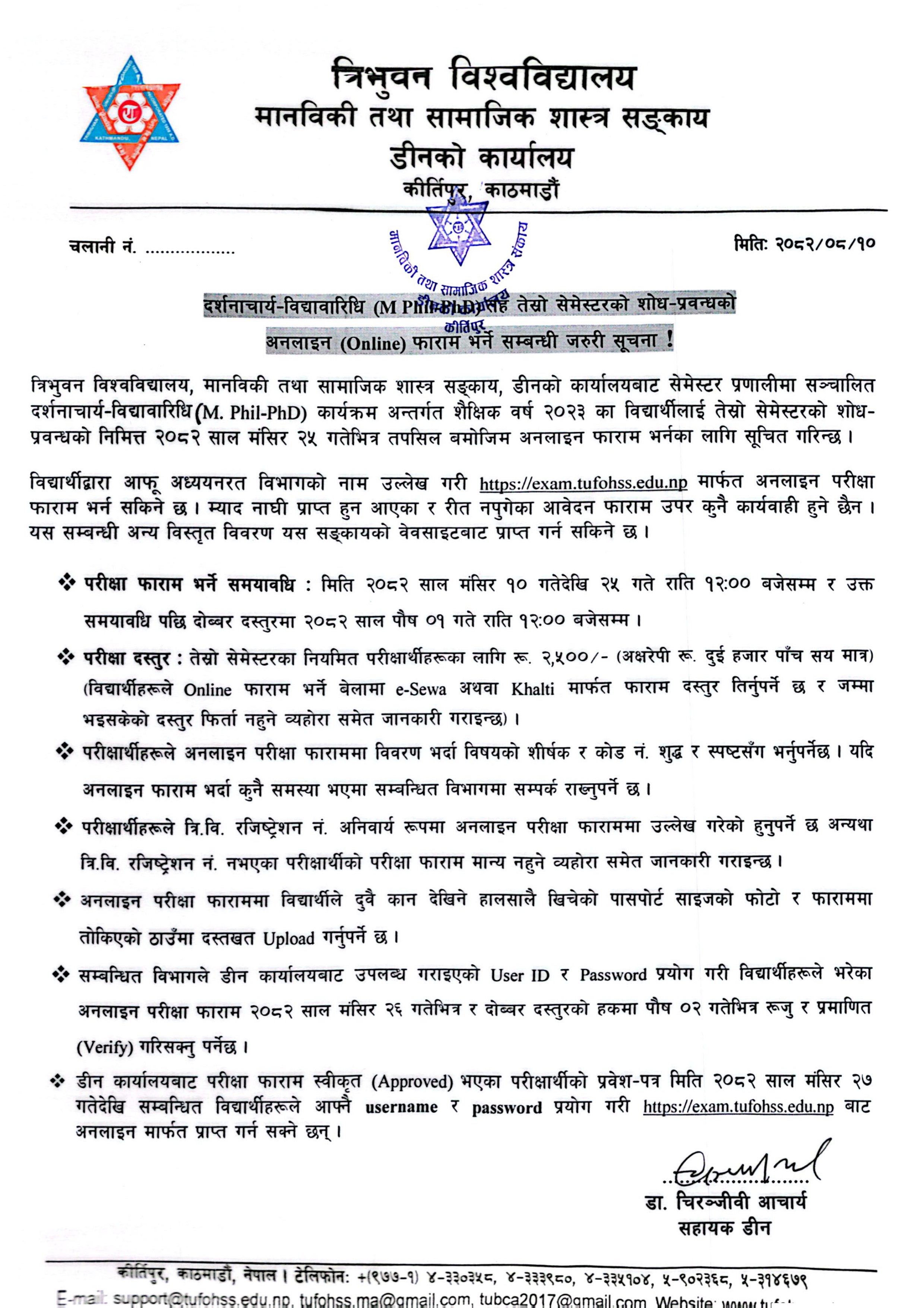 शैक्षिक सत्र २०८०/८१ (𝐌𝐏𝐡𝐢𝐥-𝐏𝐡𝐃 𝟐𝟎𝟐𝟑) समूहको तेस्रो सेमेस्टरको शोध-प्रबन्धको अनलाइन फाराम भर्ने सम्बनी जरुरी सूचना ।