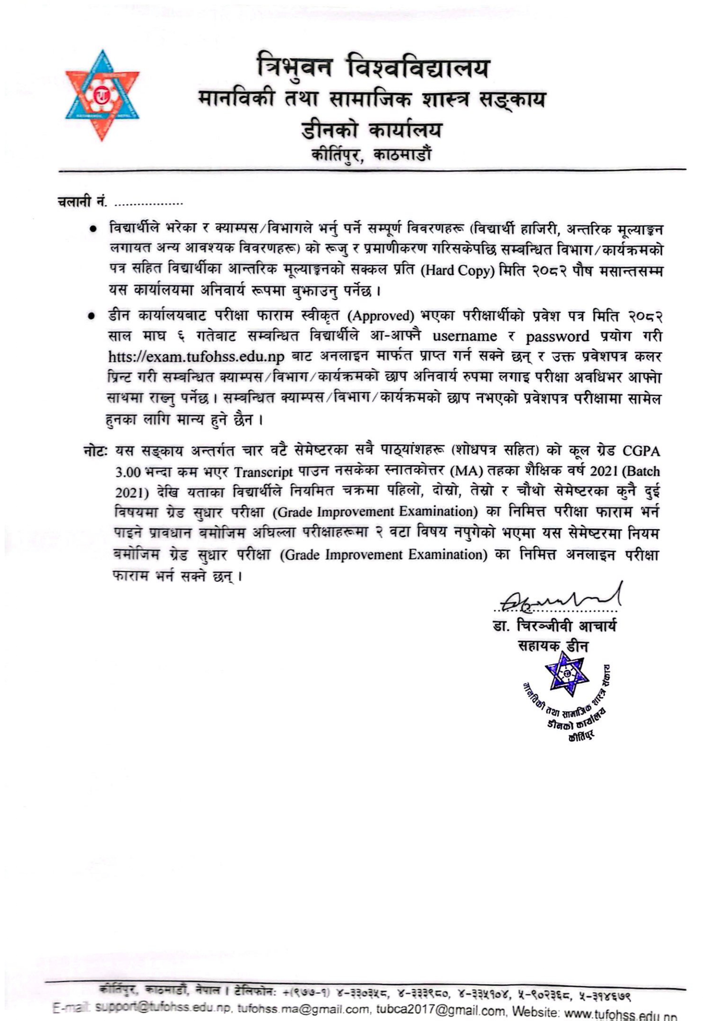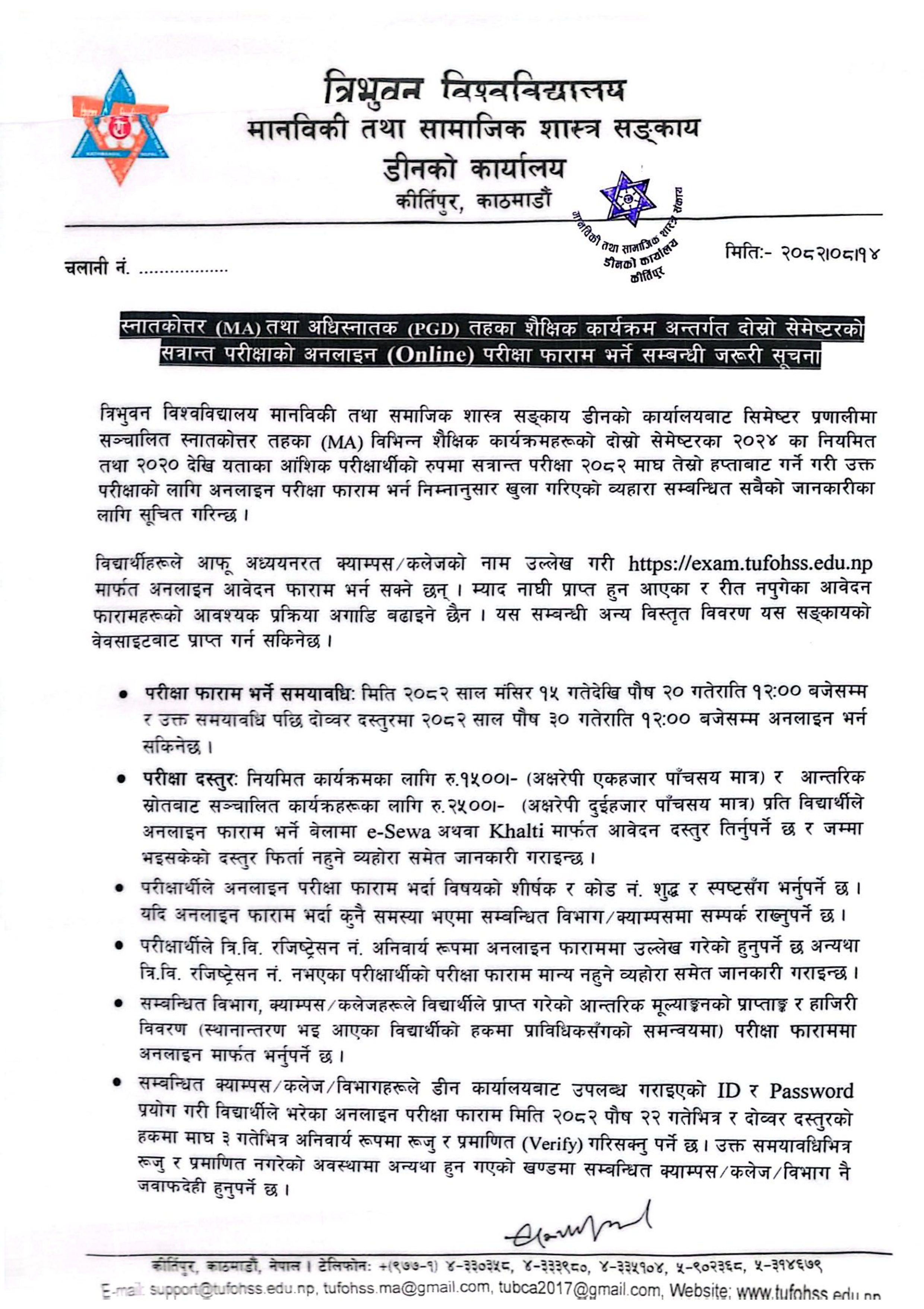 स्नातकोत्तर𝐌𝐀 तह शैक्षिक सत्र २०८१/८२(२०२४)मा भर्ना भई दोश्रो सेमेष्टरमा अध्ययनरत विद्यार्थीहरुको लागी दोस्रो सेमेटरको सत्रान्त परीक्षाको अनलाईन परीक्षा फाराम भर्ने सम्बन्धी जरुरी सूचना ।
