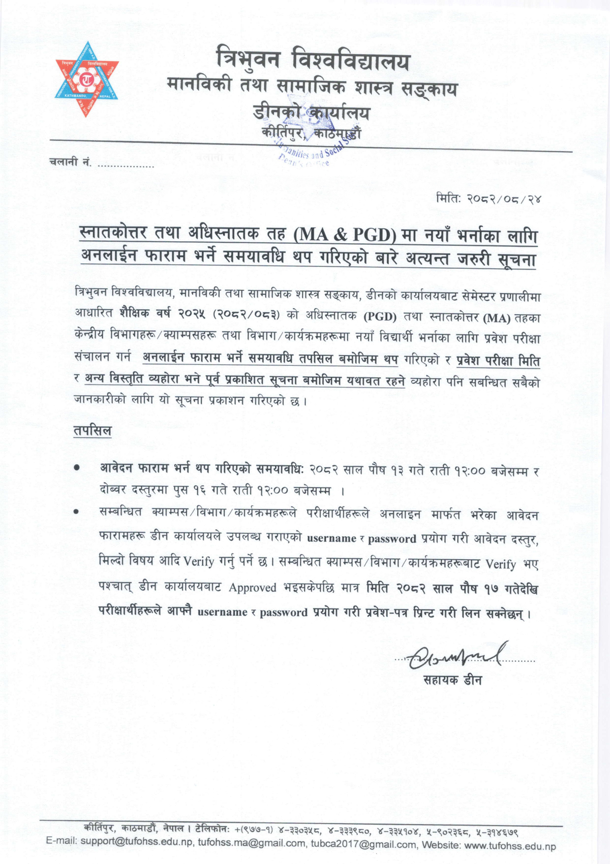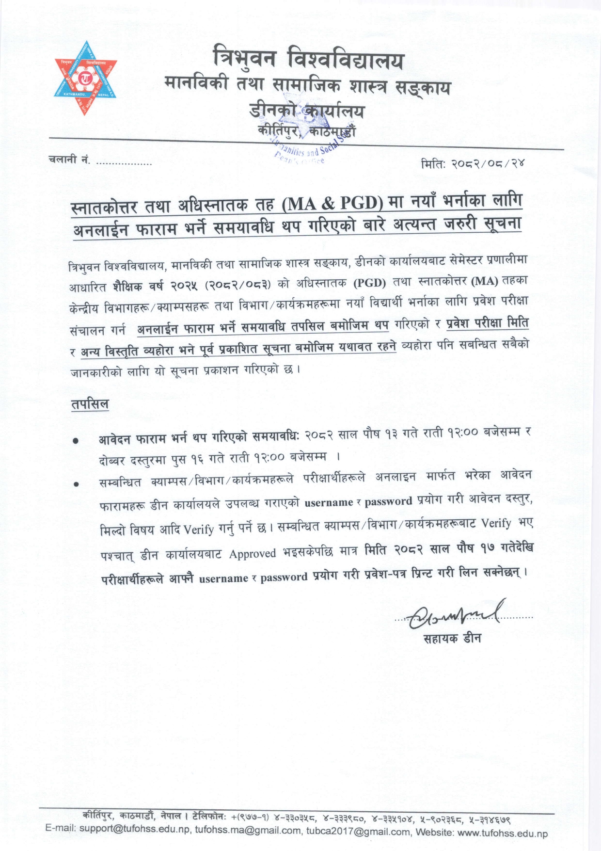 स्नातकोत्तर (MA) तहमा शैक्षिक सत्र २०८२/८३ (2025) अन्तर्गत नयाँ भर्नाका लागि अनलाईन फाराम भर्ने समयावधि थप गरिएको सम्बन्धी अत्यन्त जरुरी सूचना ।