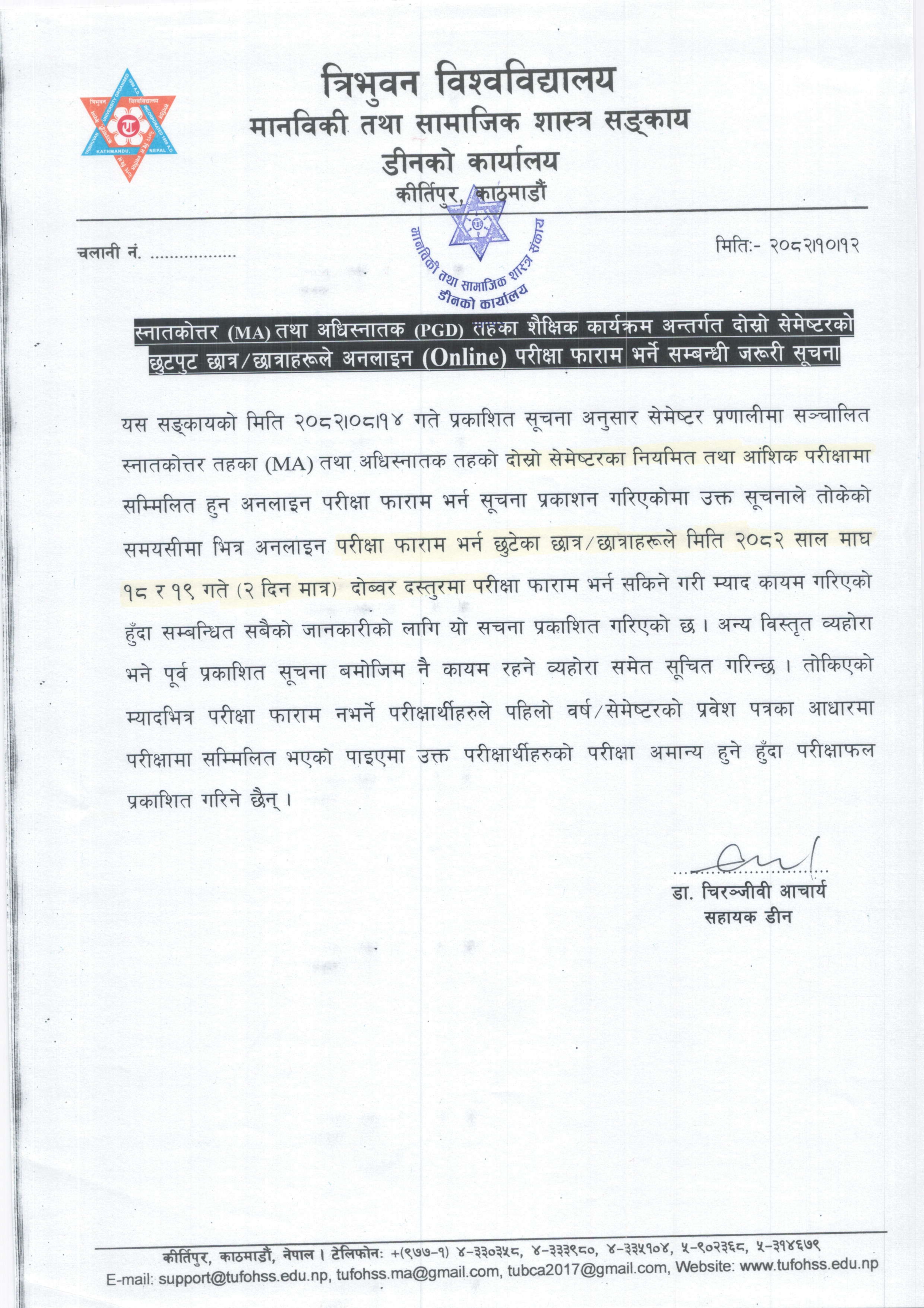 MA दोस्रो सेमेस्टरको परीक्षा फाराम भर्ने म्याद थप सम्बन्धमा ।
