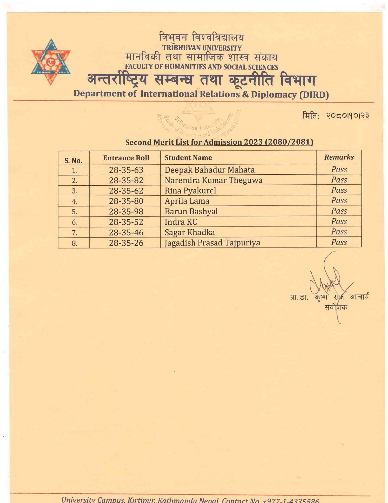 DIRD ADMISSION SECOND MERIT LIST FOR ADMISSION