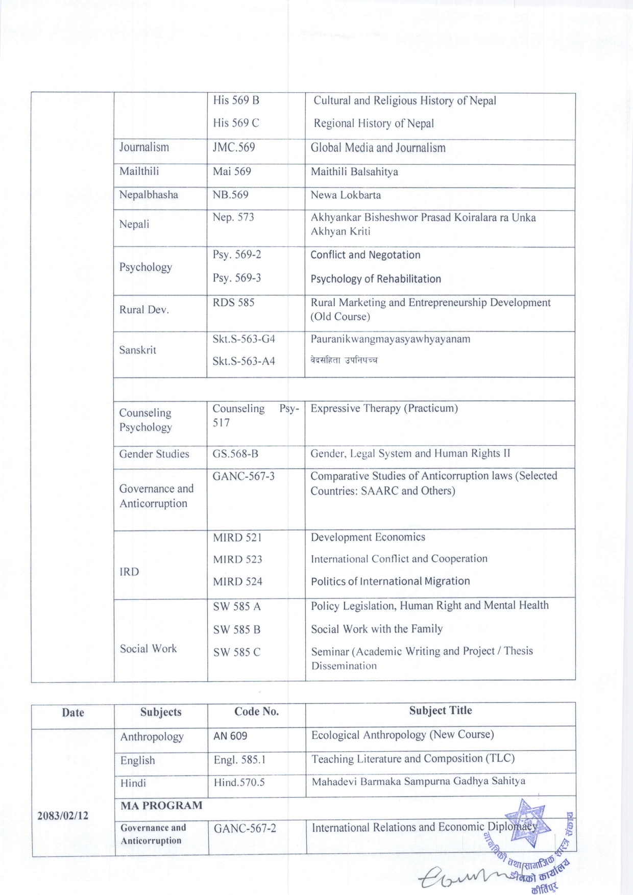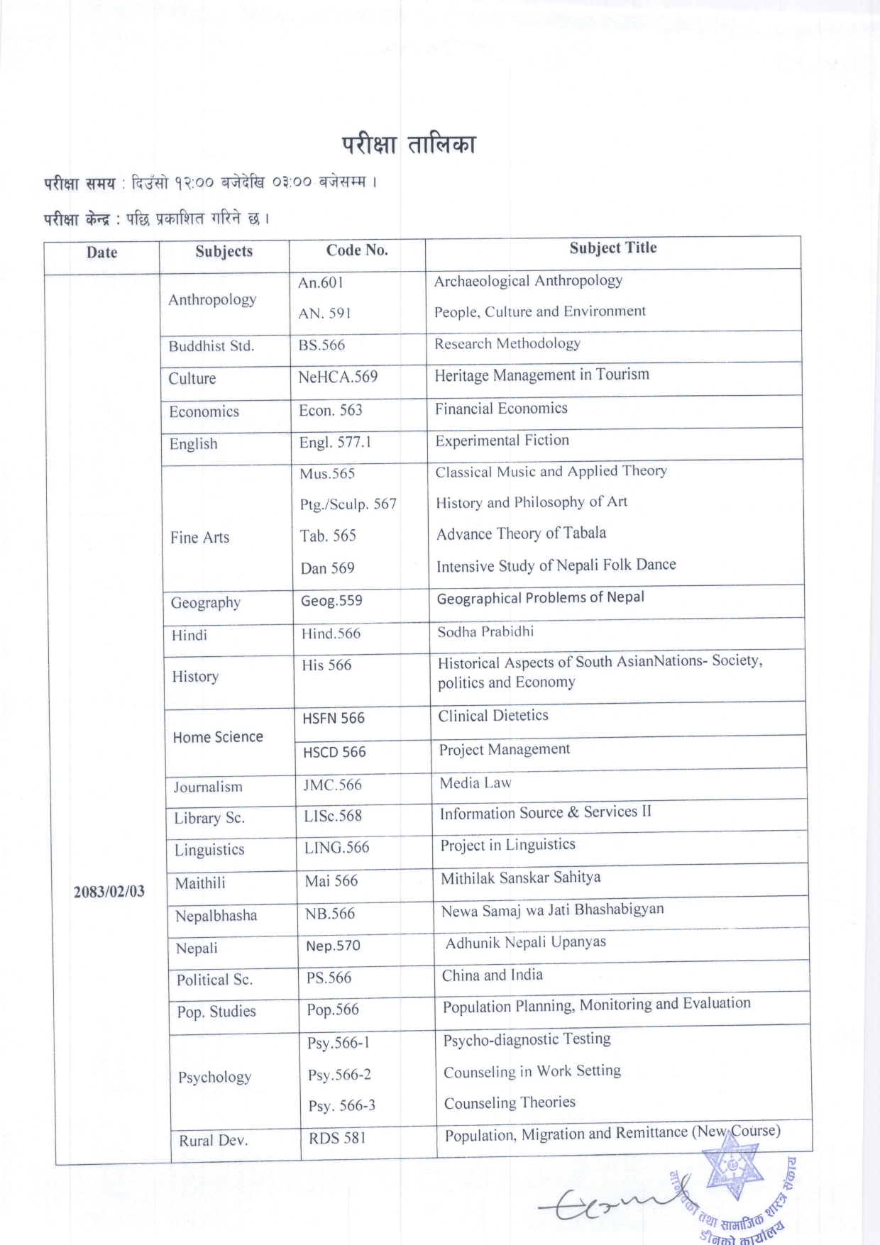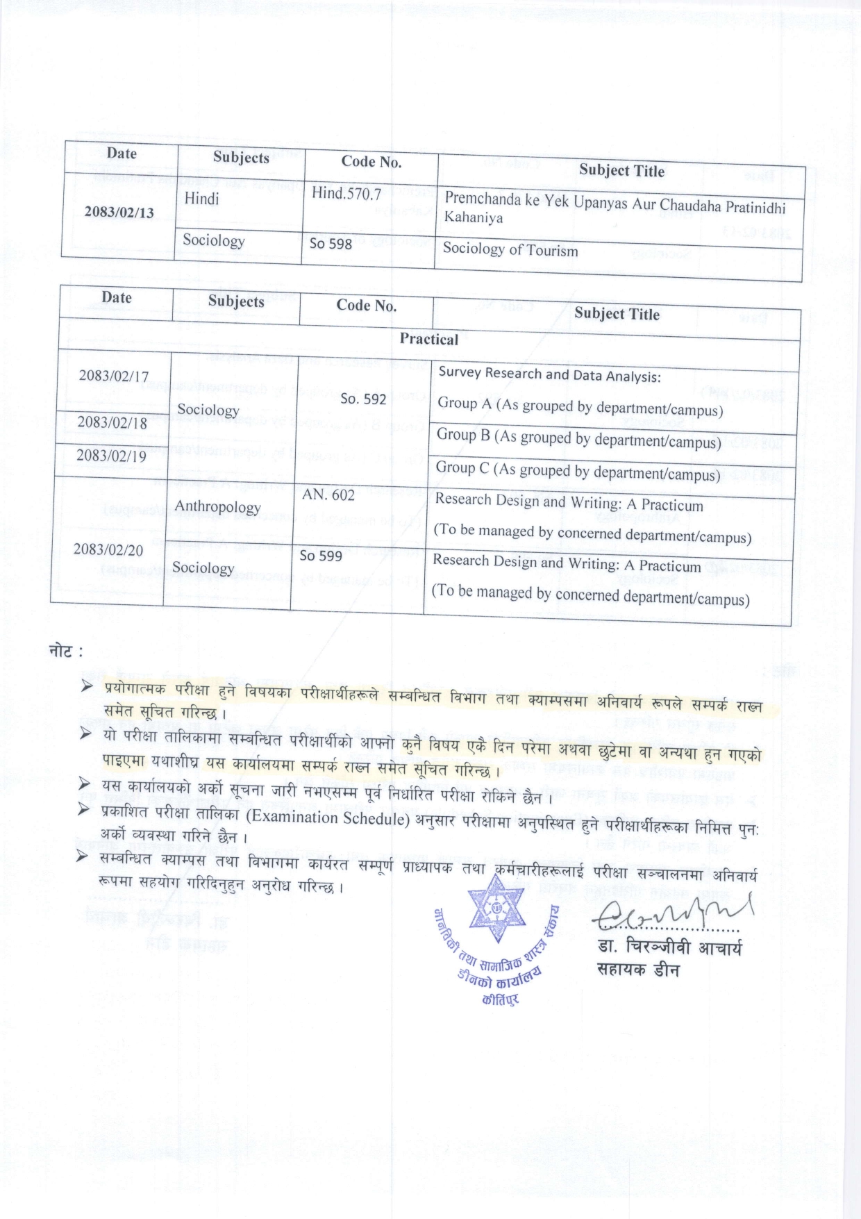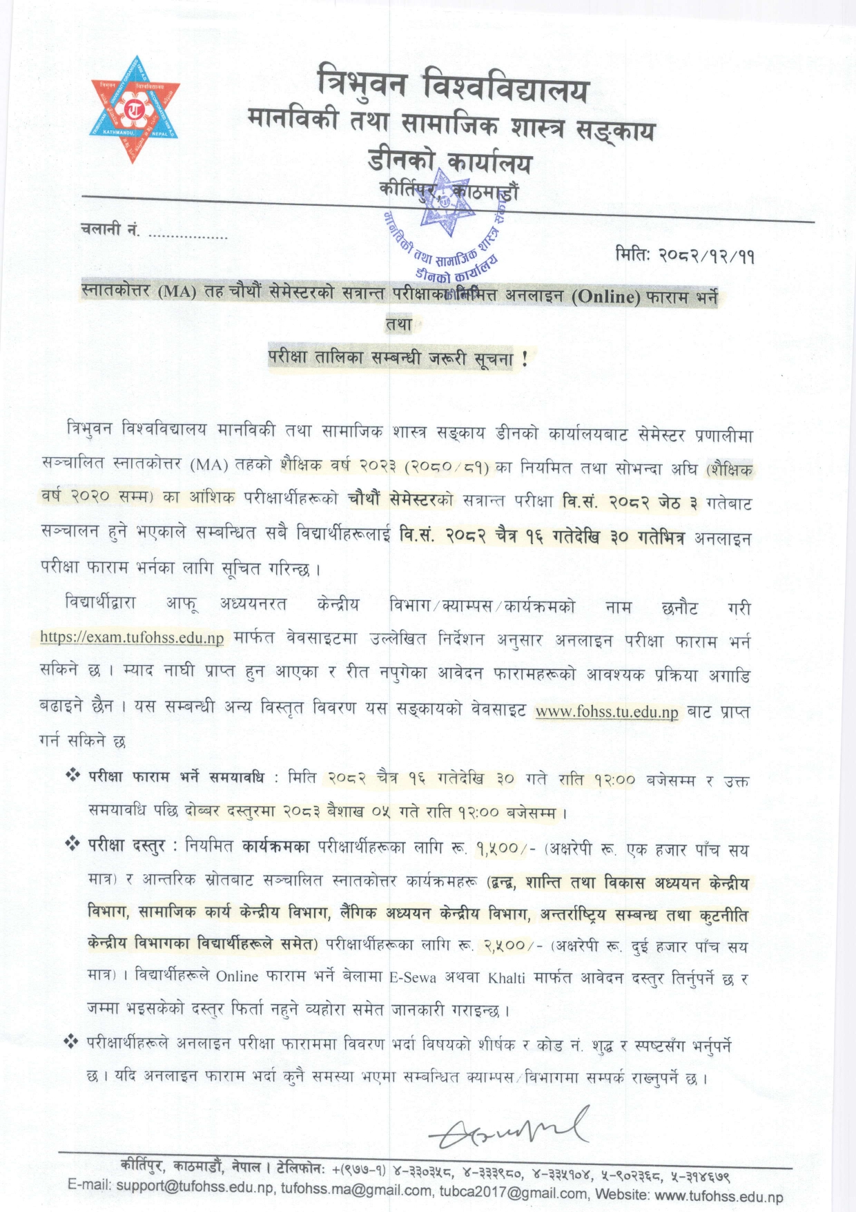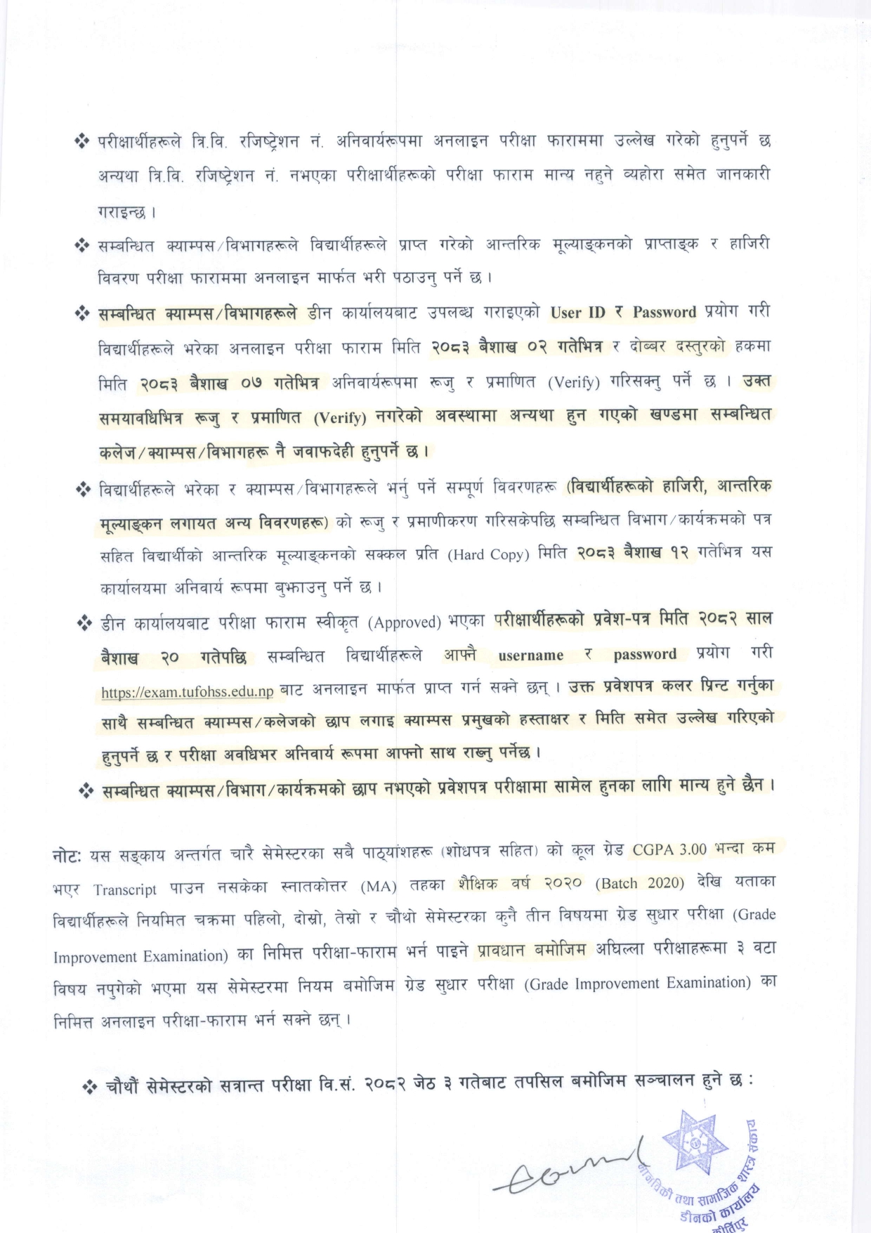 स्नातकोत्तर (MA) तह चौथौं सेमेस्टरको सत्रान्त परीक्षाका निमित्त अनलाइन फाराम भर्ने तथा परीक्षा तालिका सम्बन्धी जरुरी सूचना ।